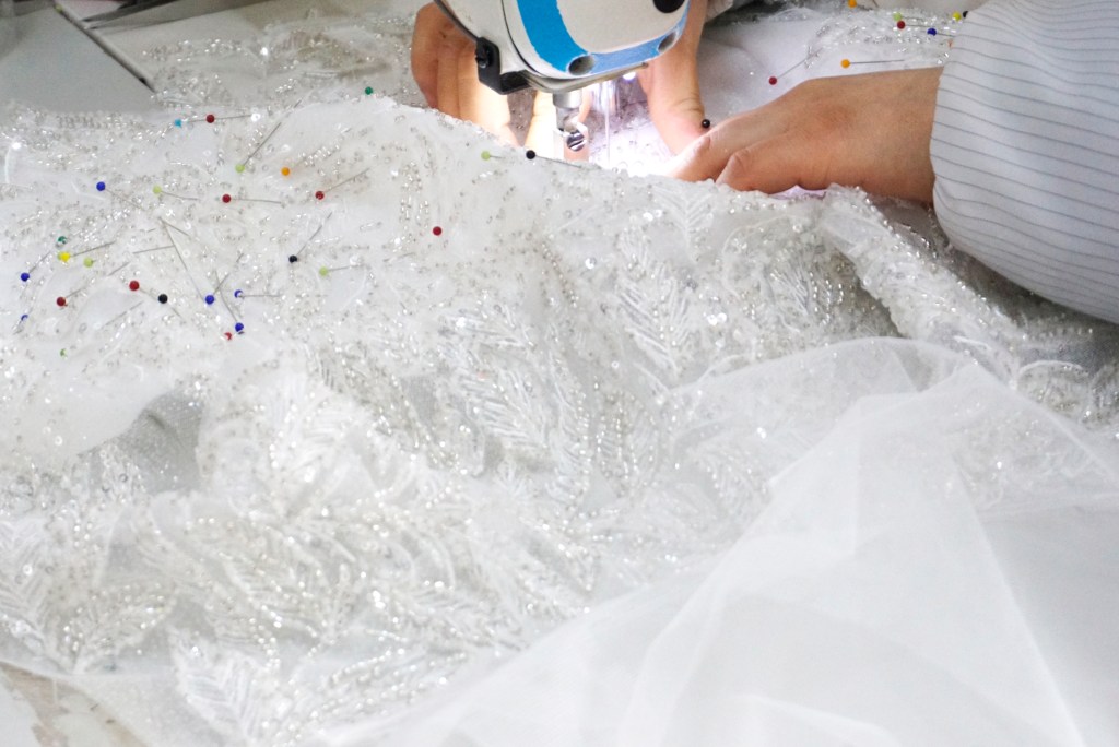 完成したとき、花嫁様が動くたびに優しくきらめくドレスに仕上がる予定です。