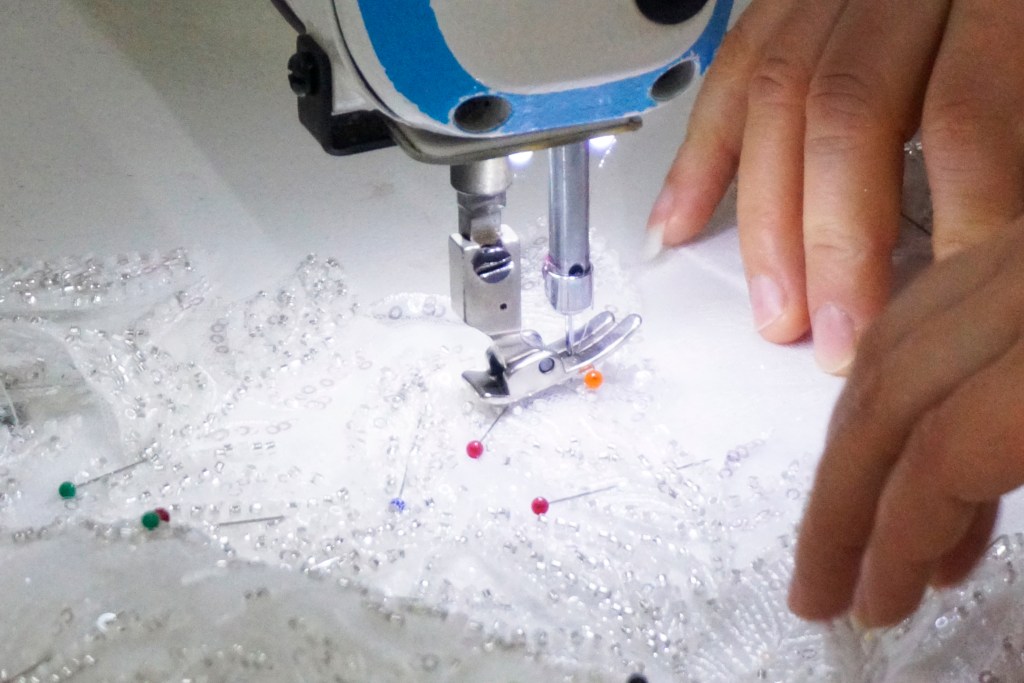 本日は、その仮止めした刺繍レースを丁寧に縫い付けていく工程のご案内です。