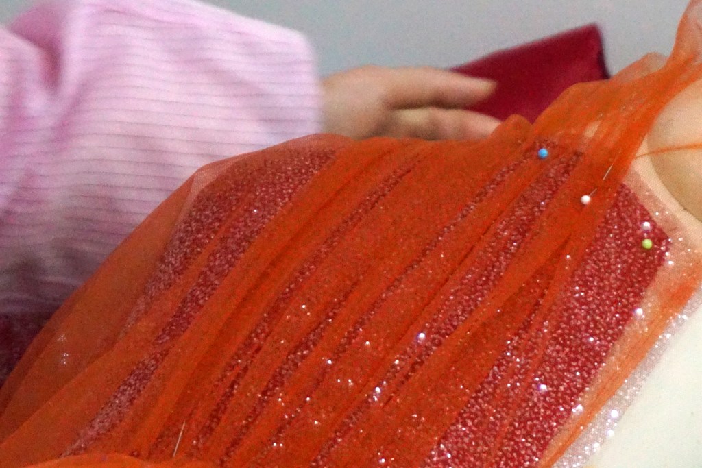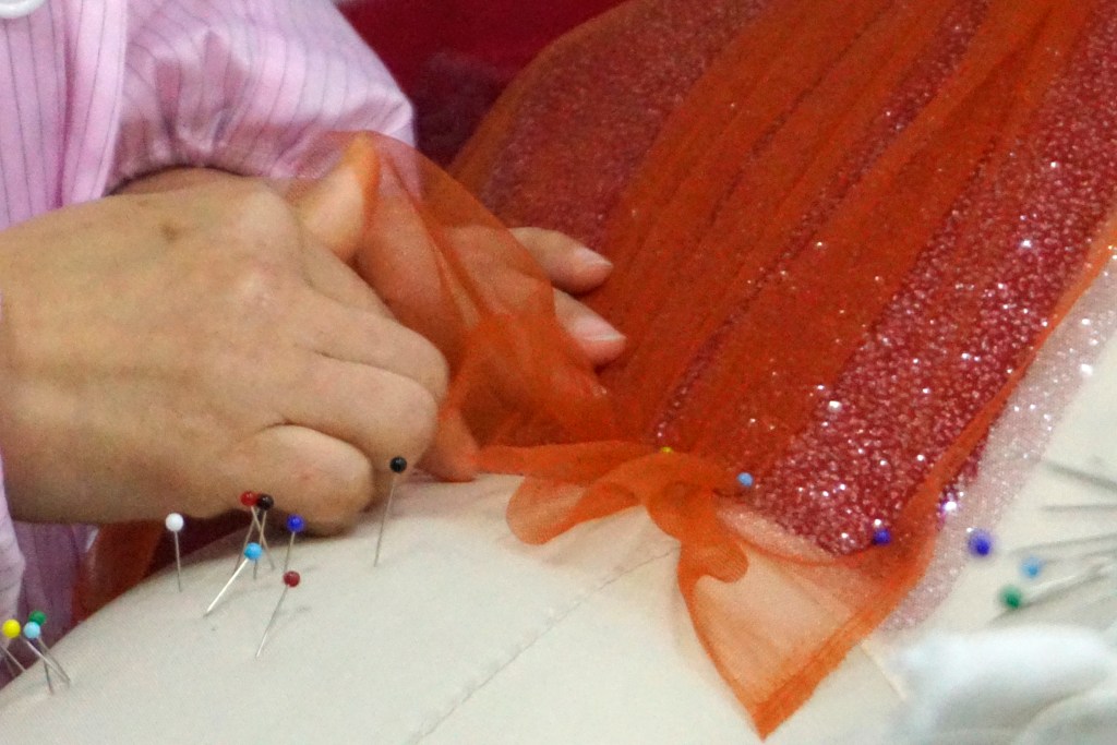 写真は、繊細なラメが輝くチュール素材をトルソーに沿わせ、待ち針で一つひとつ丁寧に仮止めしているところです。