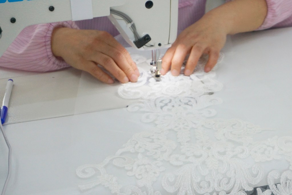 一針一針、丁寧にレースを重ねながら仕上げていくこの工程は、ドレスづくりの中でも特に大切な時間です。