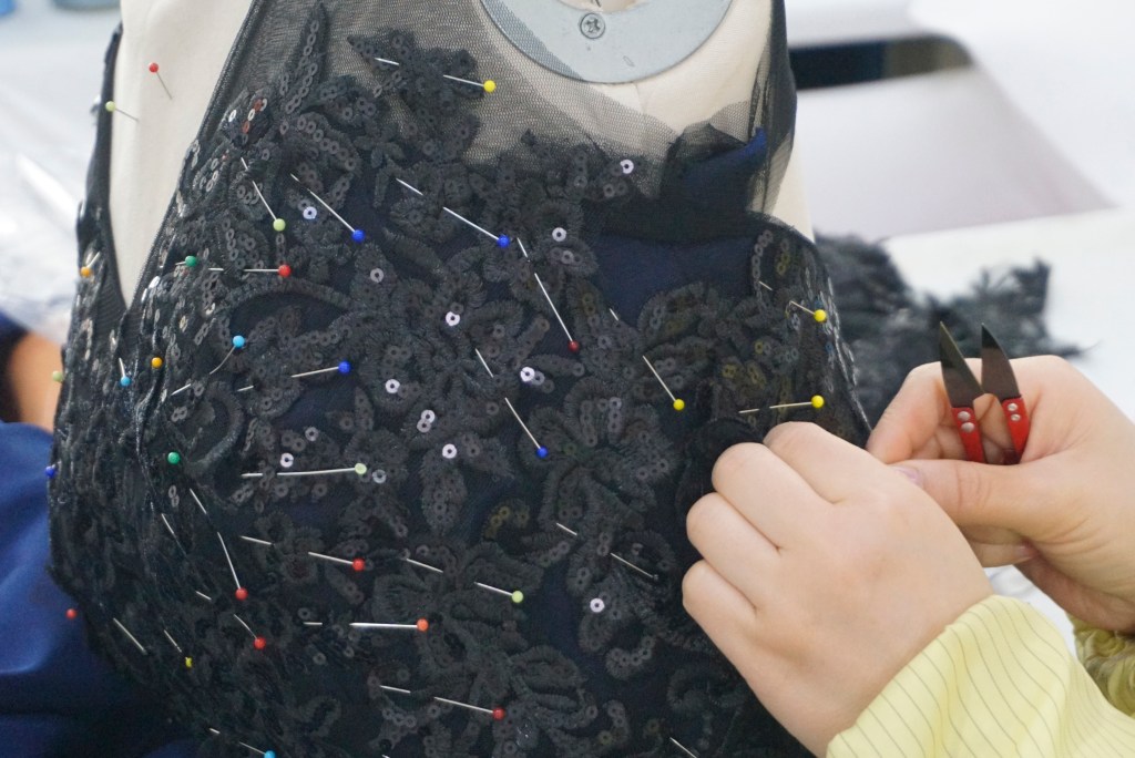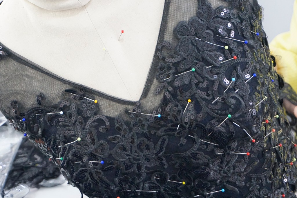 今回の工程では、繊細なレース素材をボディに合わせてピン打ちし、立体的なシルエットを細かく調整しています。