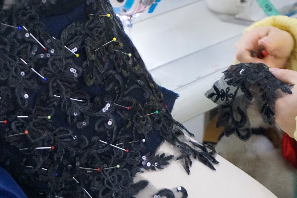 今日は黒の刺繍レースを使用したドレスを制作しています。