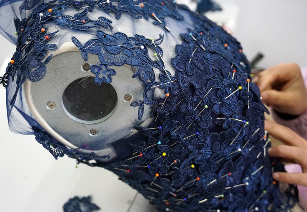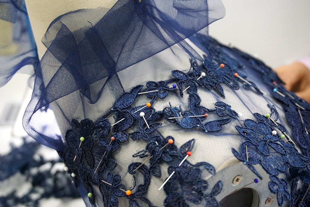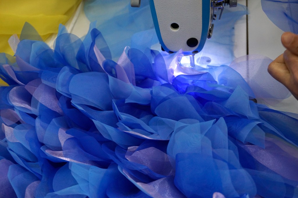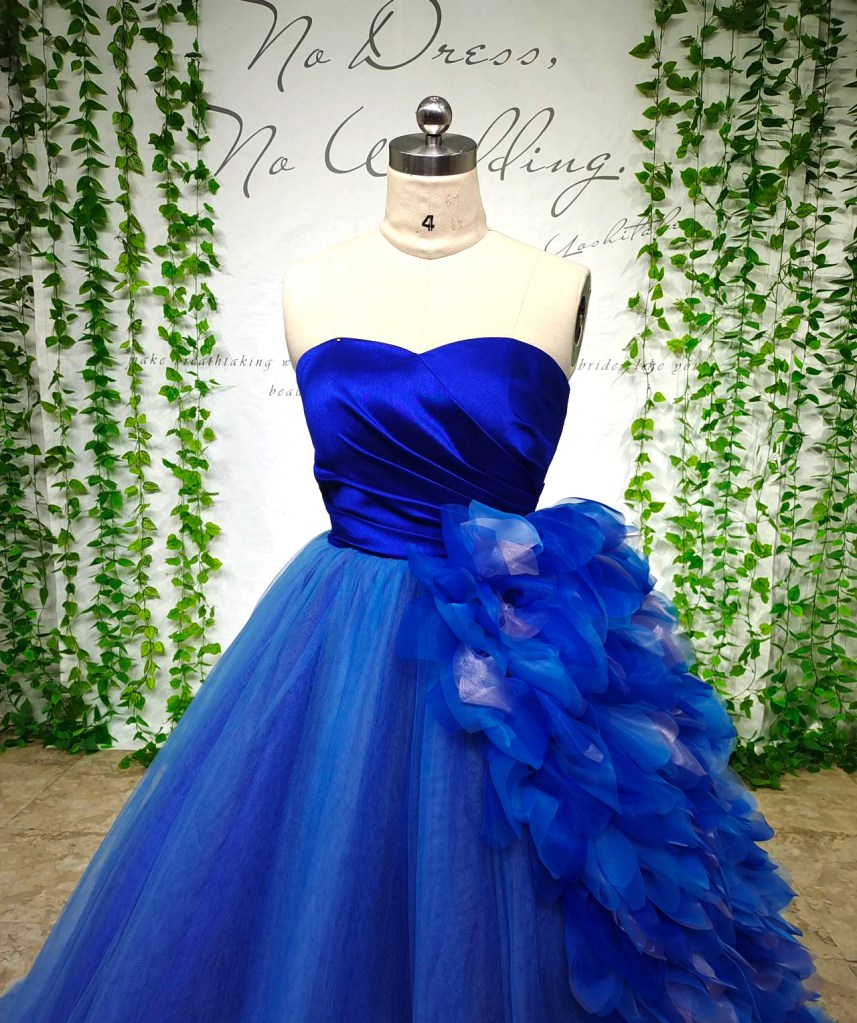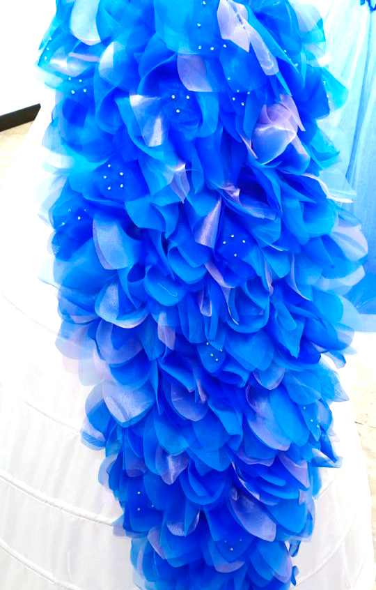 2色の濃淡のあるブルーを使用したドレスを制作。