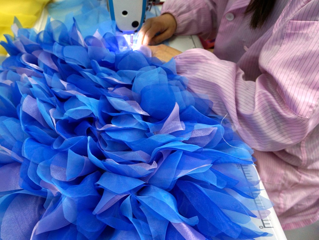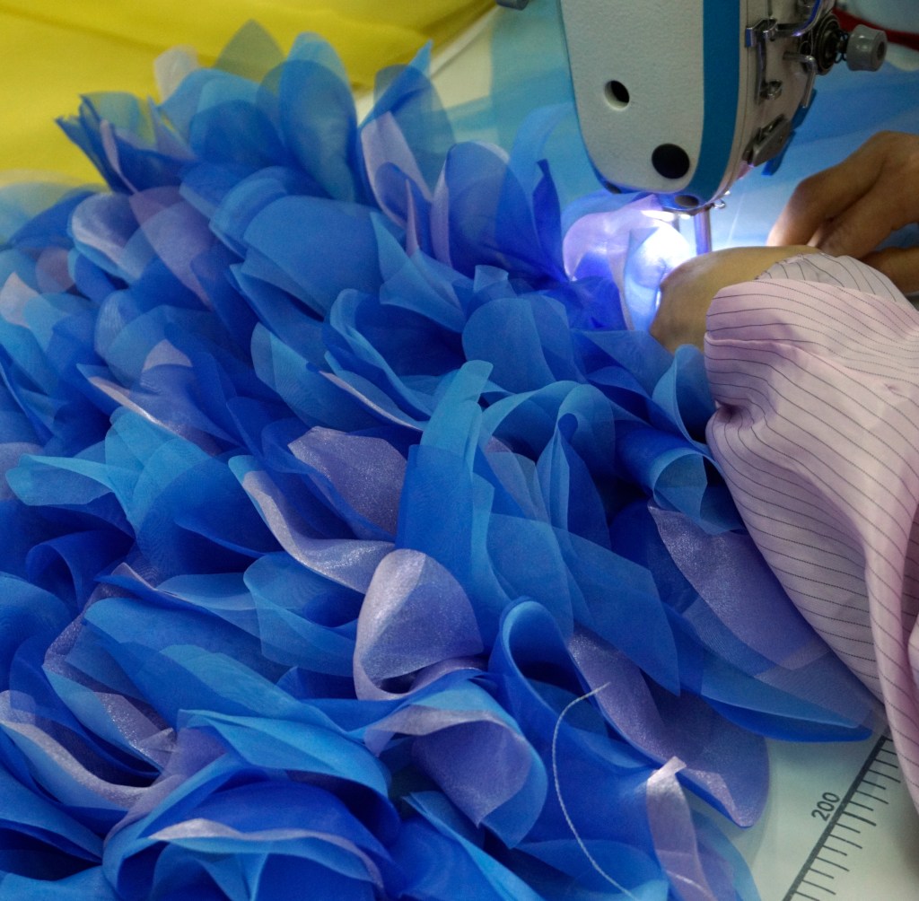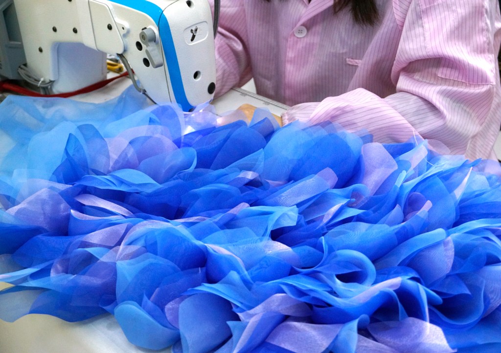 上半身にキラキラしたラメチュールを追加し、プリーツ(皺加工)をつくっていってます。