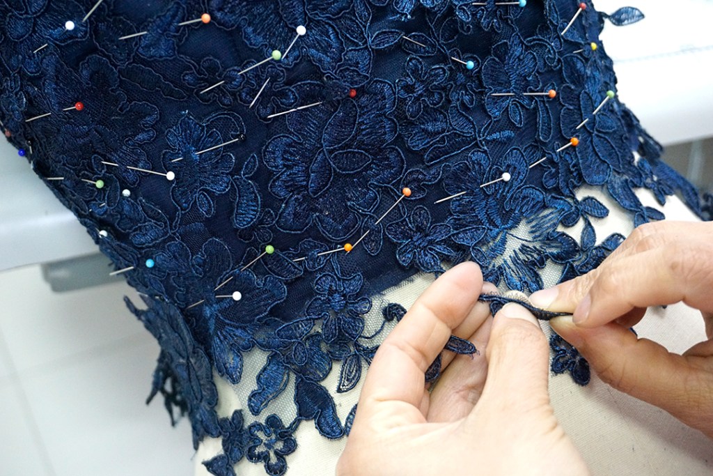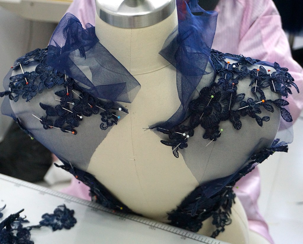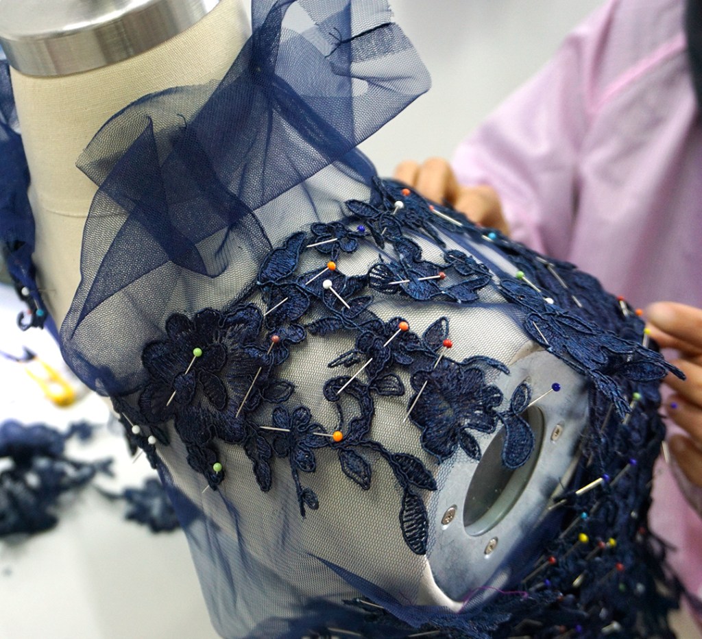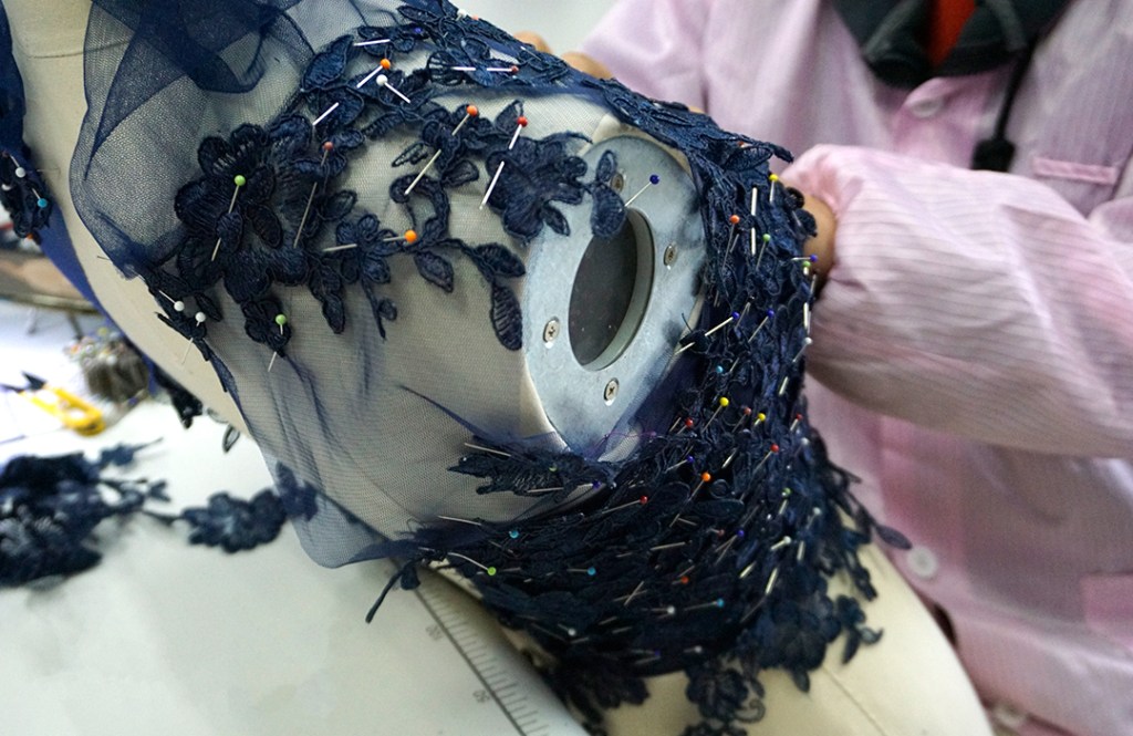 その染色したレースを上半身に一枚一枚ピンでとめて位置を確認していきます。