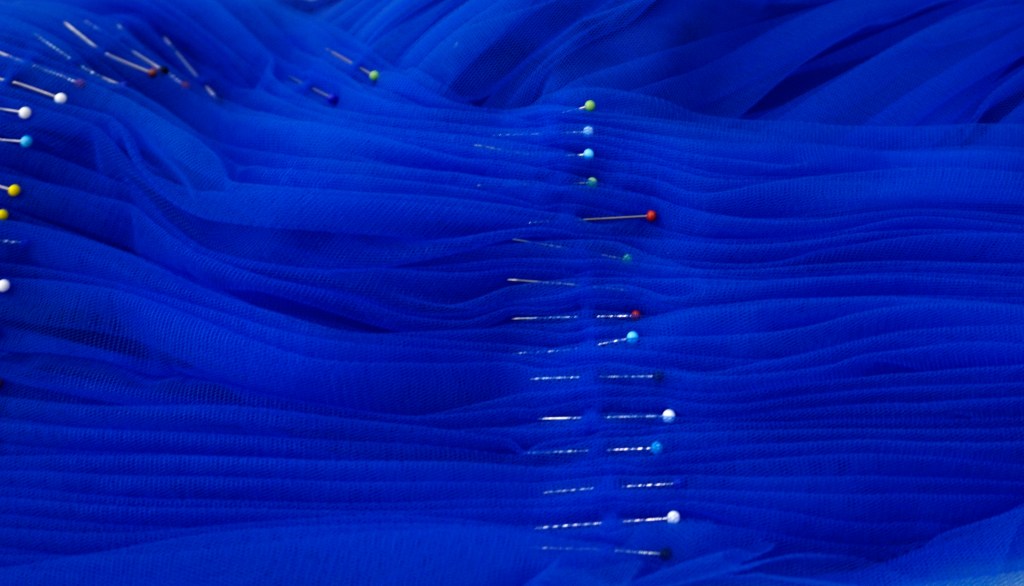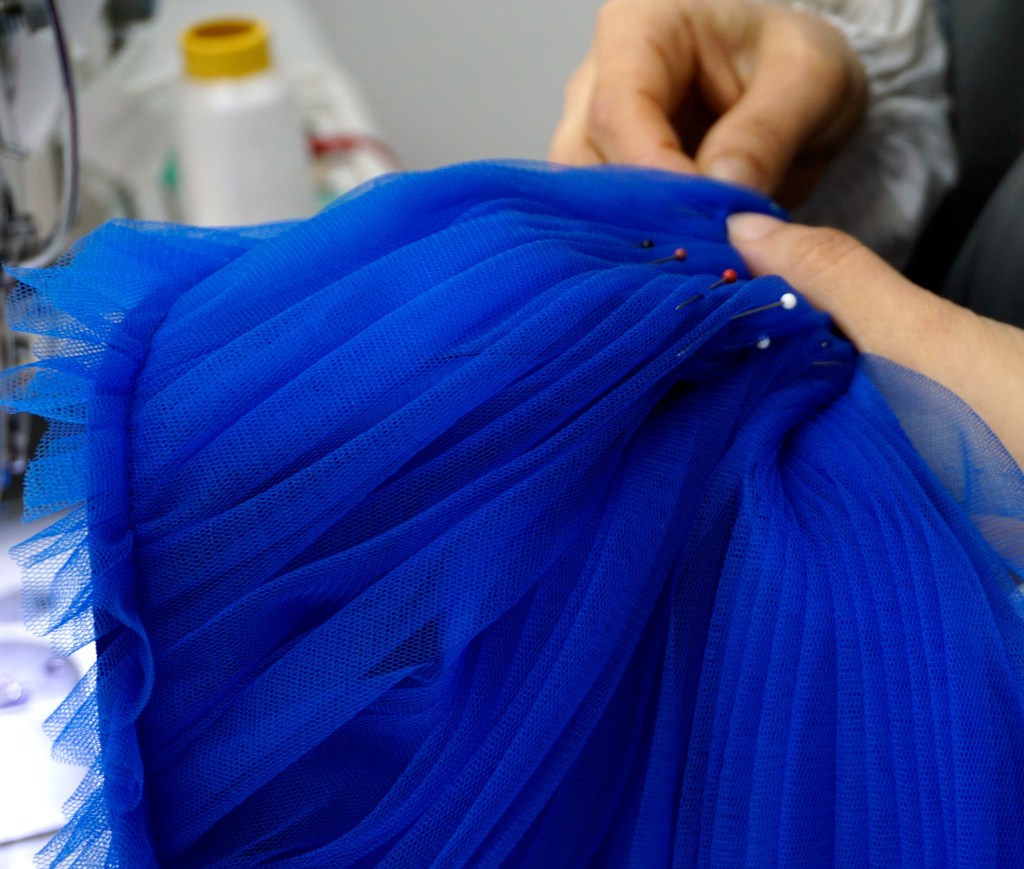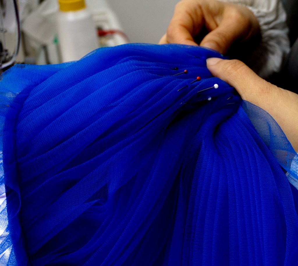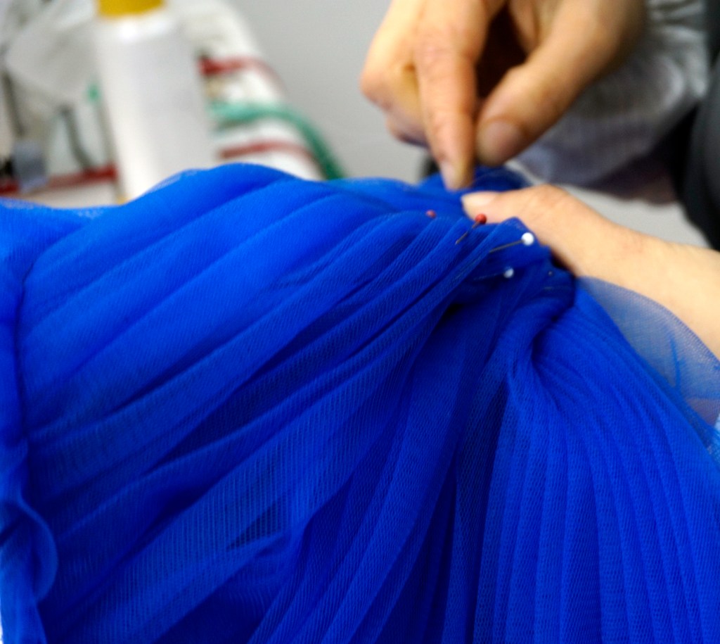 背中は大きく開いて大胆に。スカートのフロンは少短めにして歩きやすさを重視いたしました。