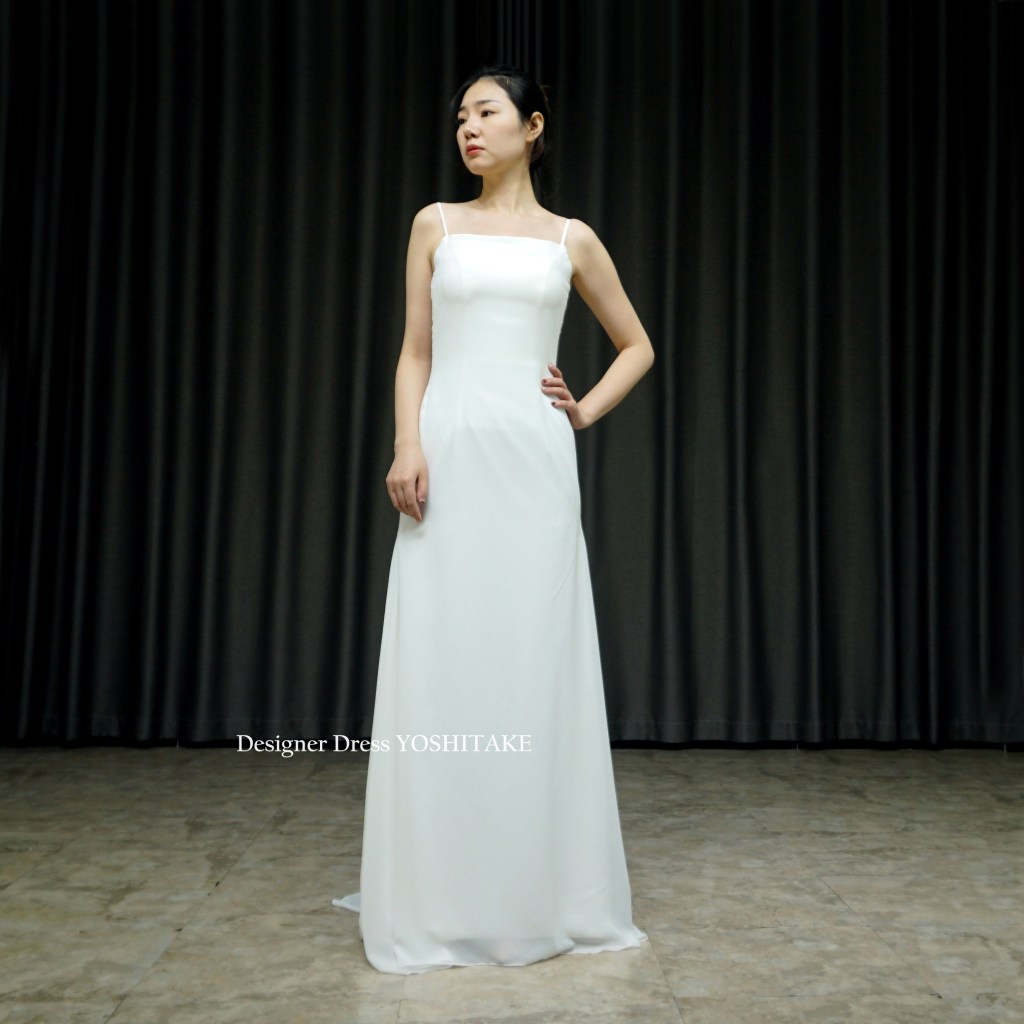 キャミソールのようなストラップタイプのウエディングドレスとなっています。