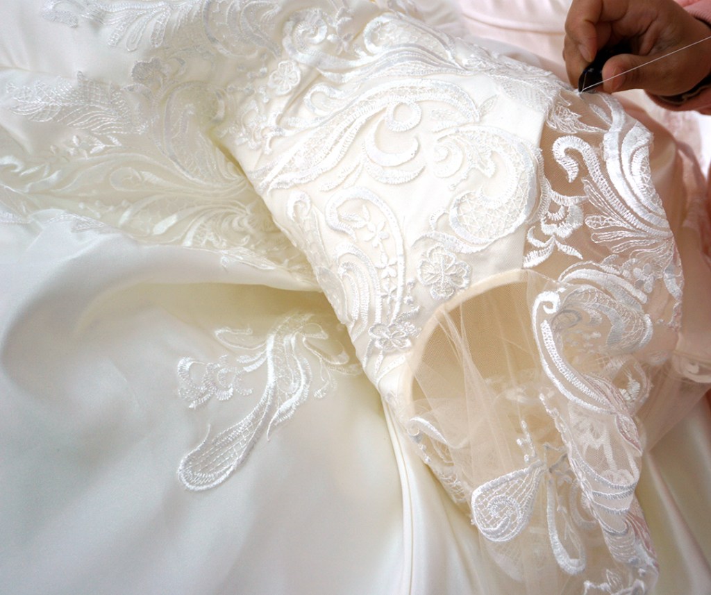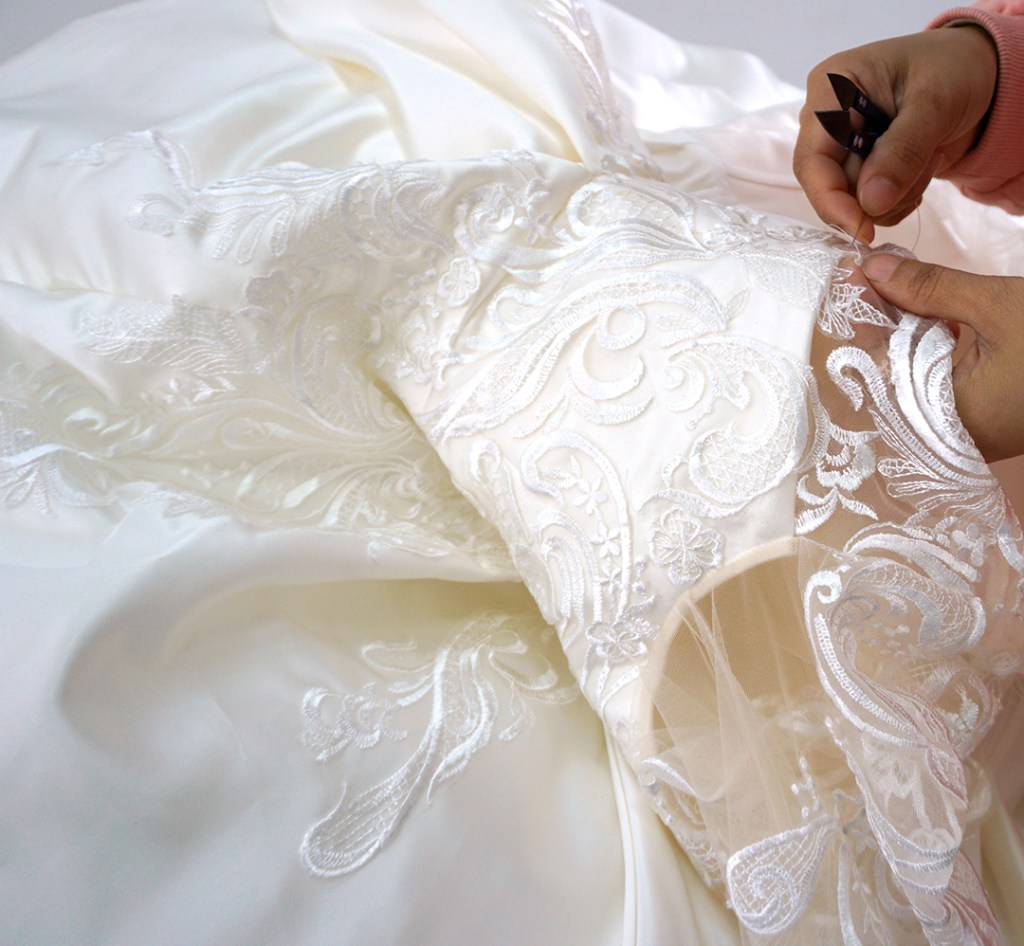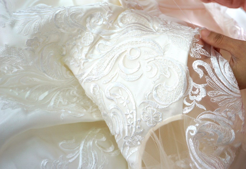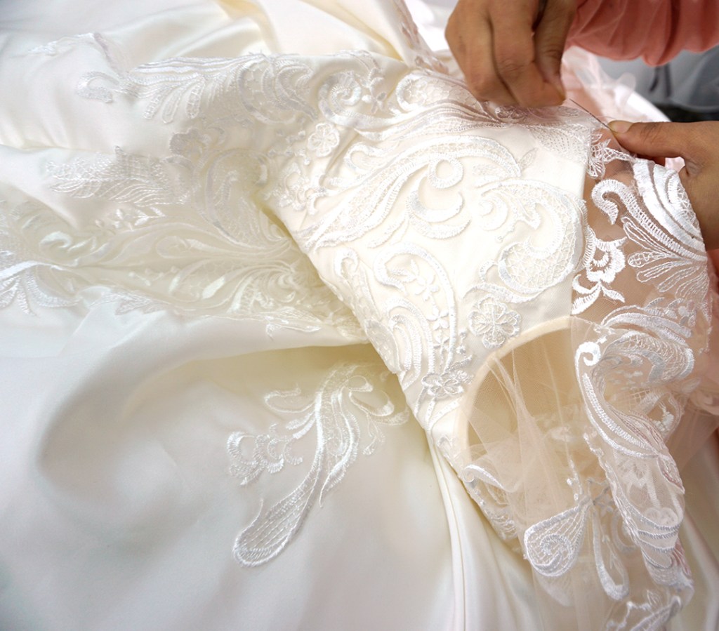 こちらは、レースに透明のビジューをひとつずつ縫い付けていきます。