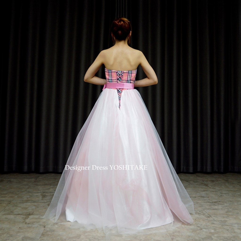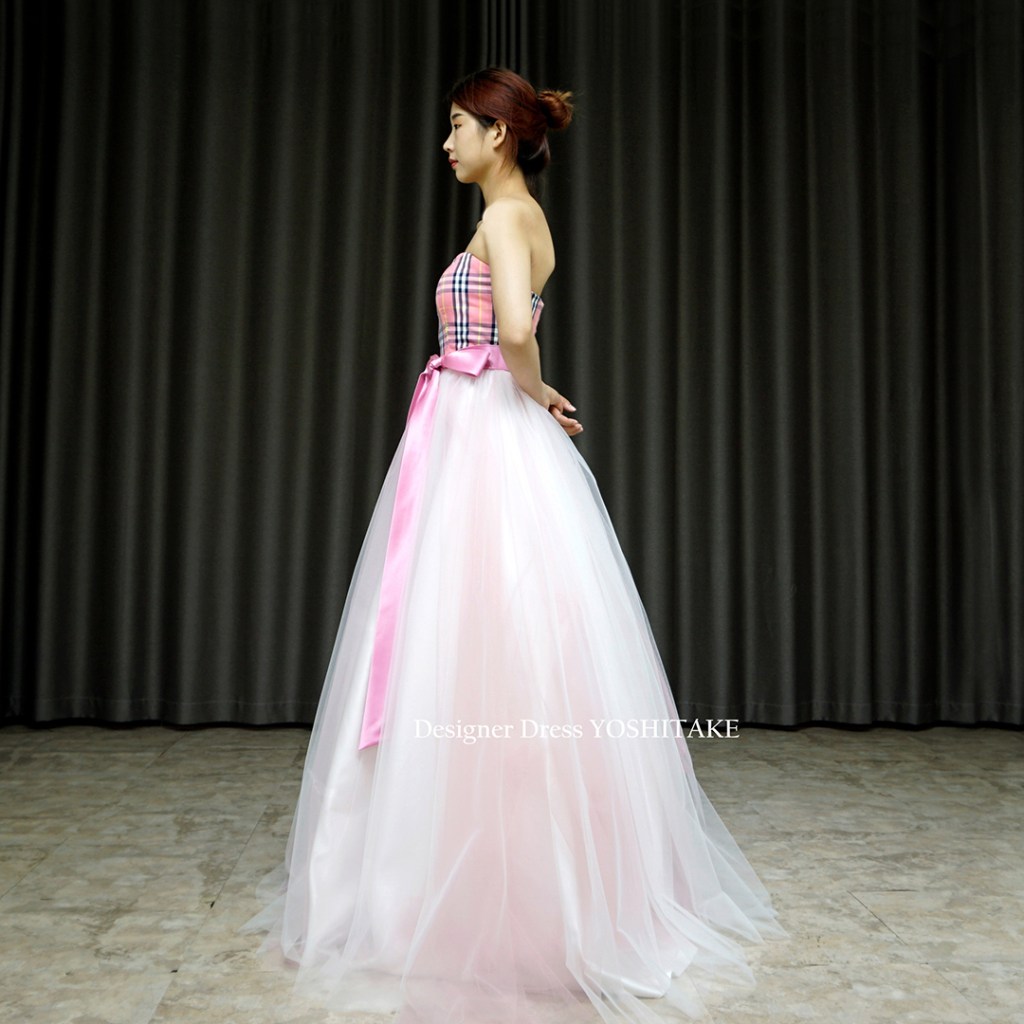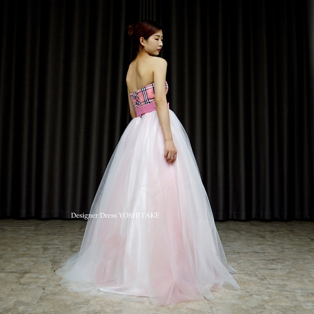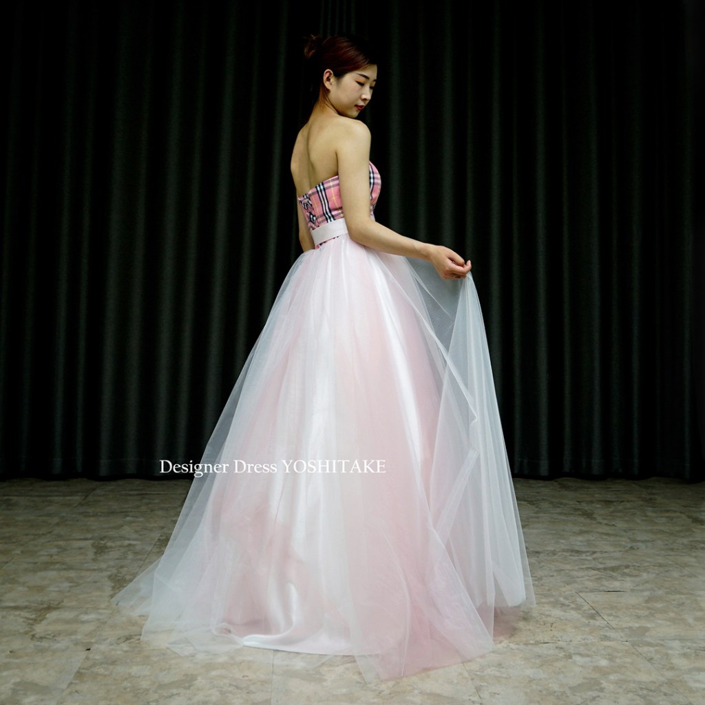 スカートは下地は暖色系の生地に、複数枚の白いチュールをかけ、ほんのりピンクカラーにしました。