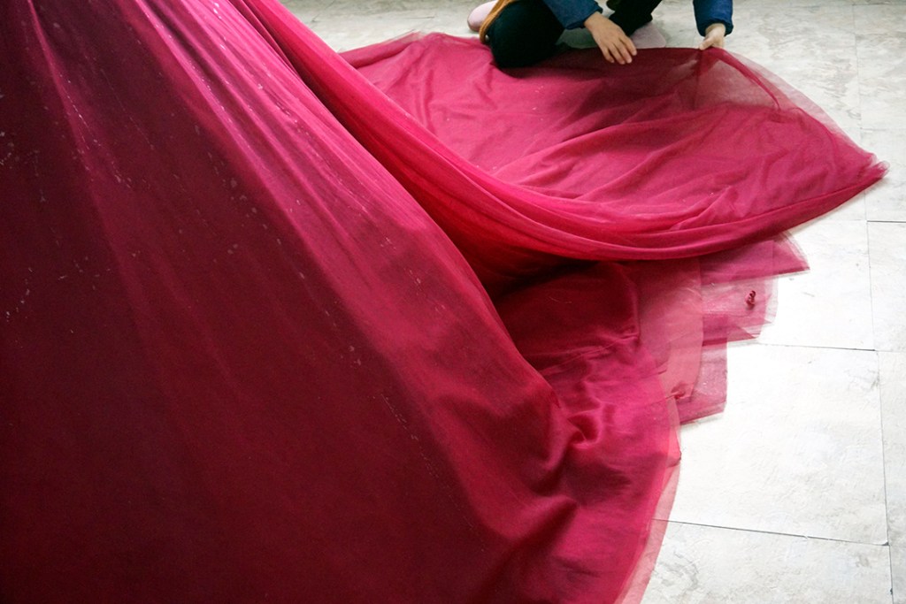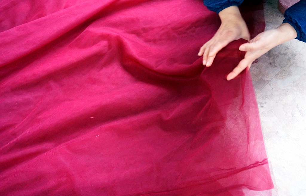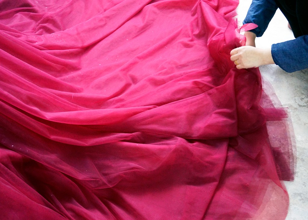 ブルーの花柄ドレスに白いチュールをかけるデザインになります。