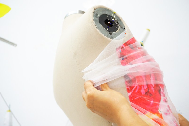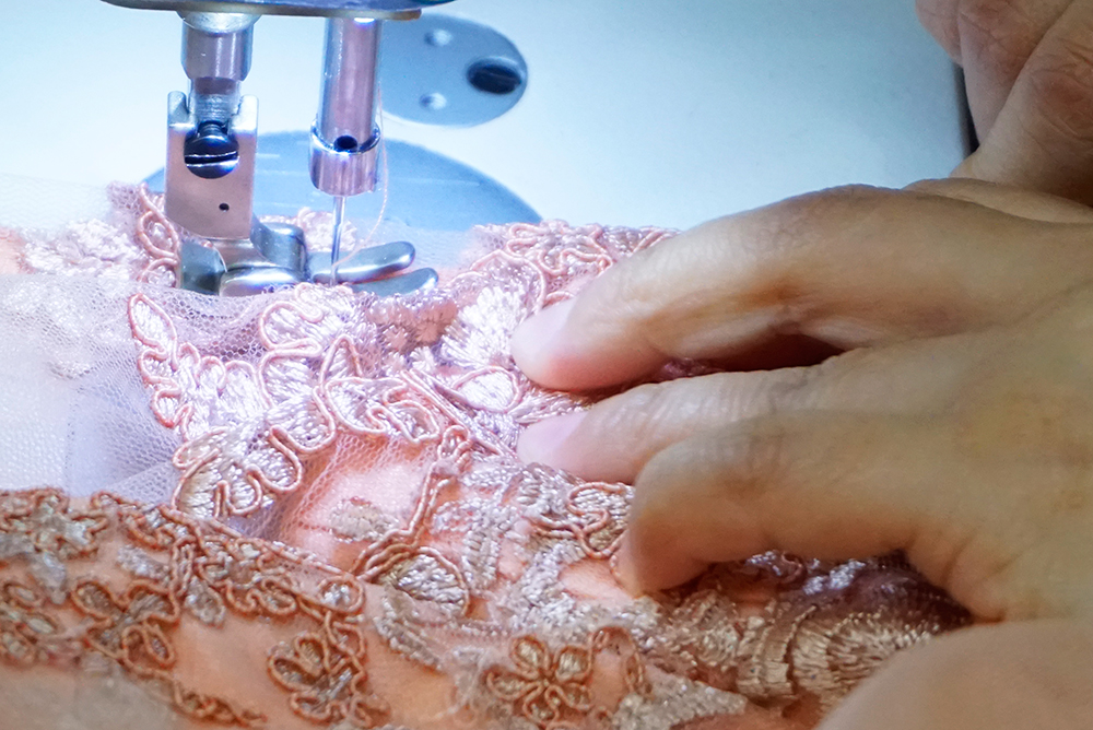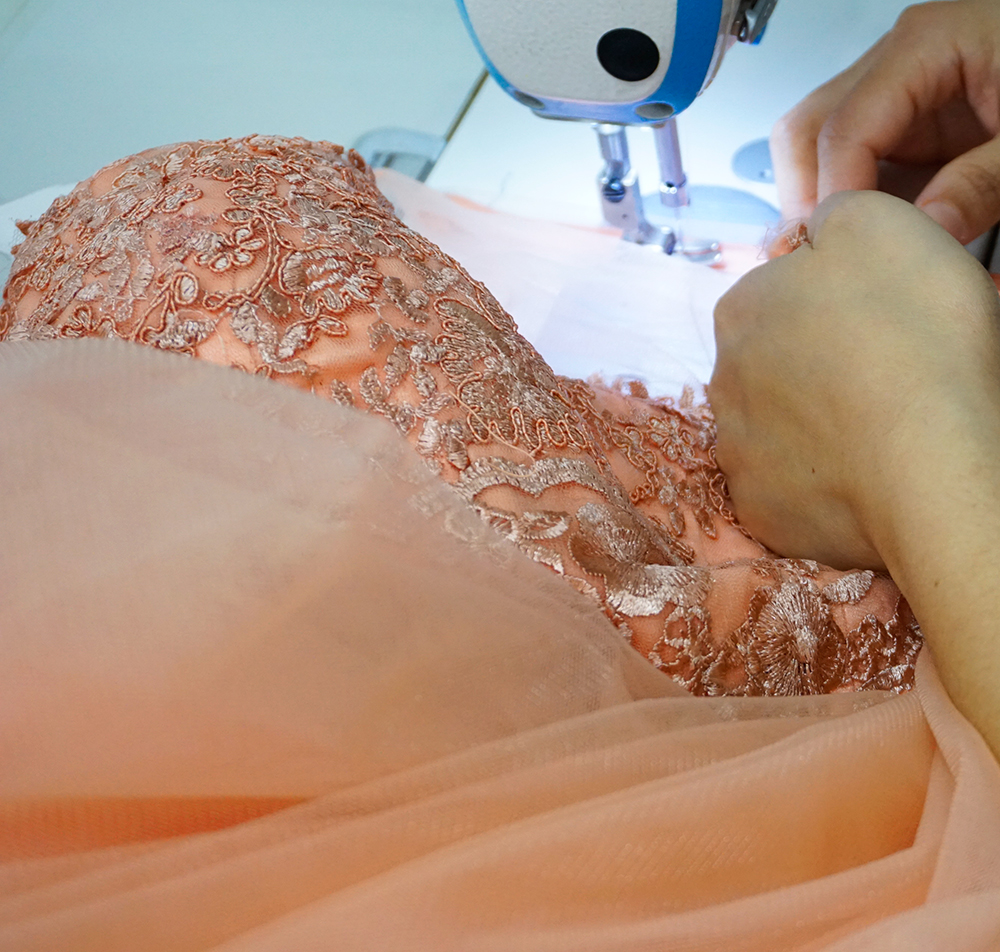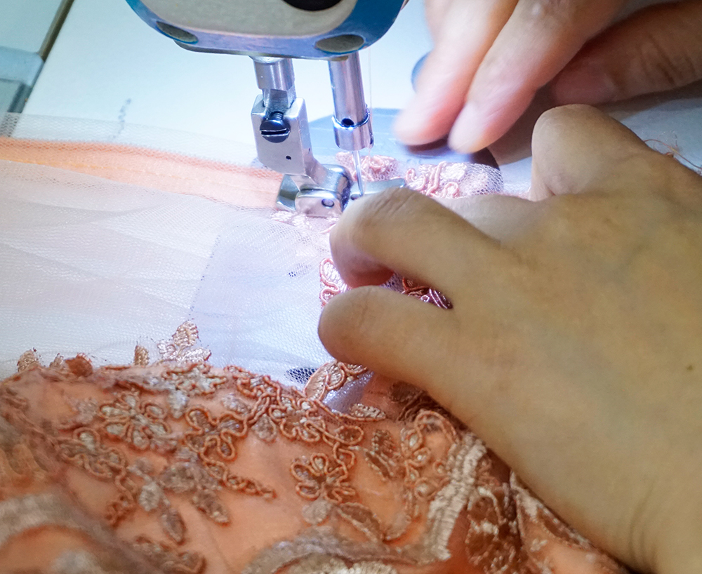 ゴールド系のサテンを下地に、全身レースで覆うドレスを作っています。